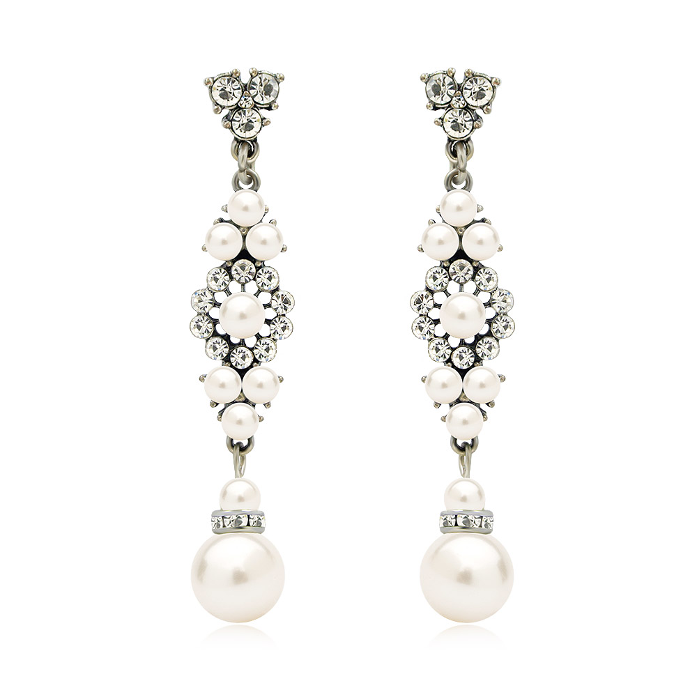 - Old Hollywood style bridal chandelier earrings with white pearls and clear crystals in a silver setting.