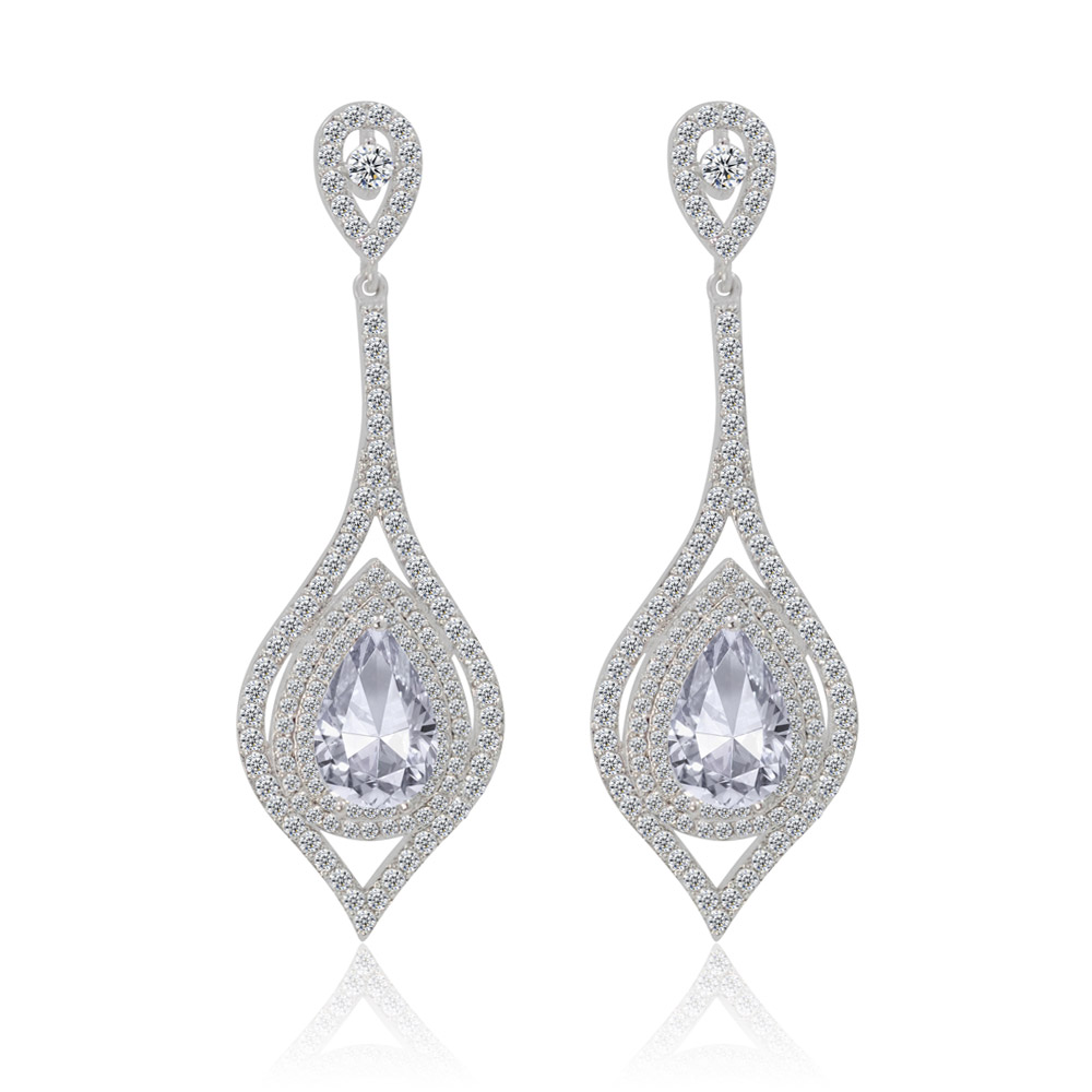 - Glamorous silver teardrop chandelier earrings encrusted with sparkling clear gemstones.