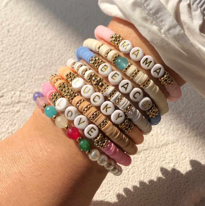 A collection of colorful polymer clay bracelets with personalized messages from the SS23 collection.