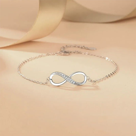 Elegant sterling silver infinity bracelet adorned with cubic zirconia.