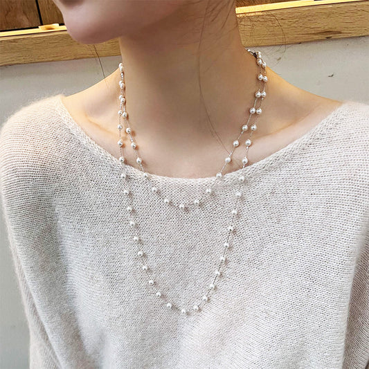 - Elegant faux pearl double-layer brass necklace modeled on a white sweater.