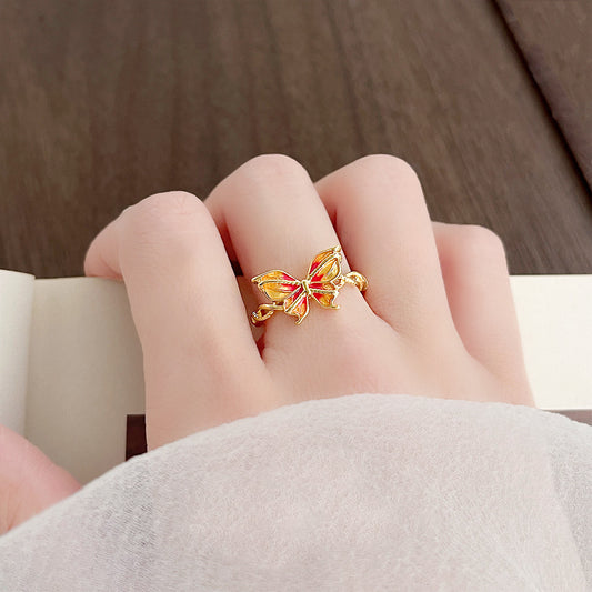 A delicate gold-plated butterfly ring with gradient orange and red enamel, worn on a finger.