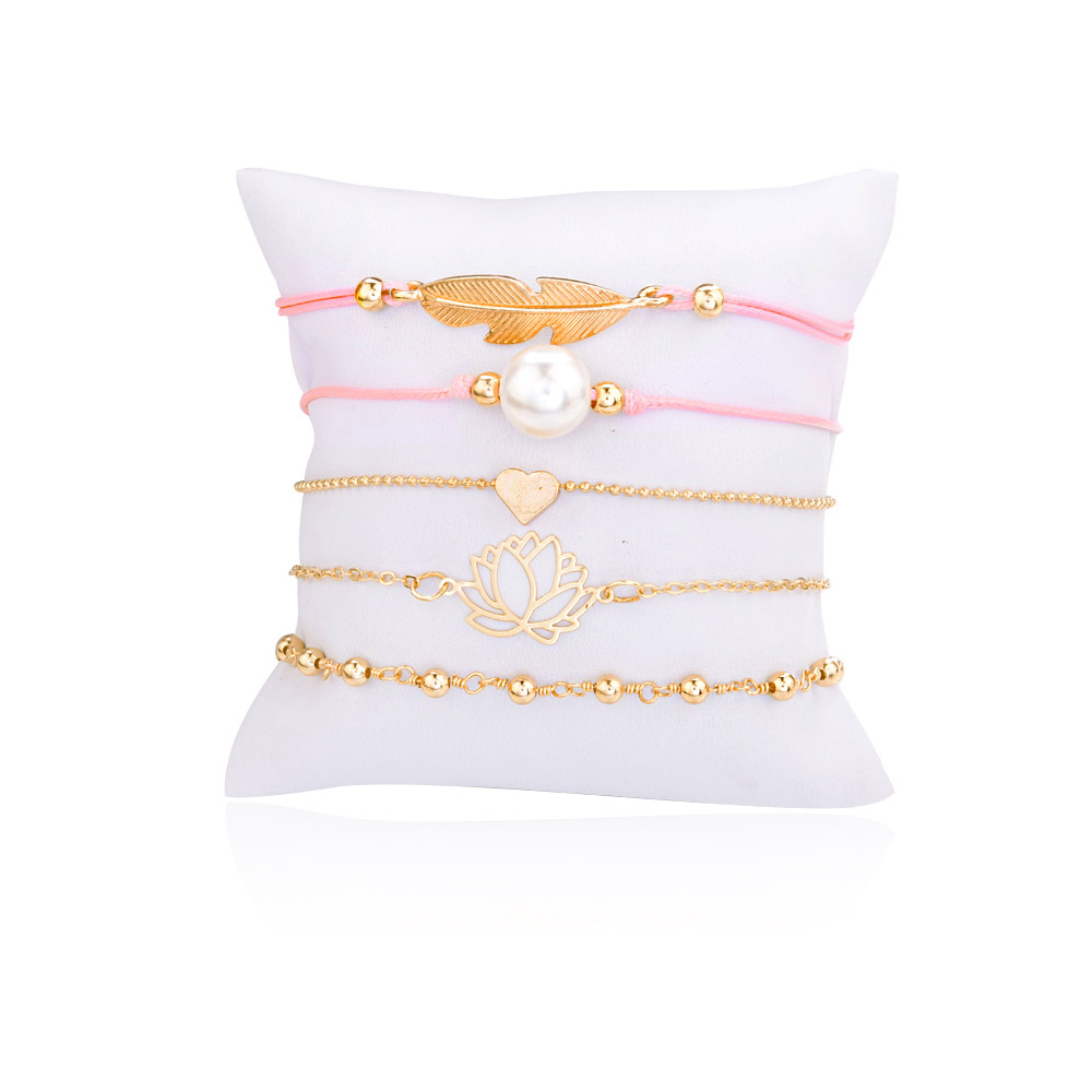 A stylish set of five stackable gold bracelets with assorted charms like feathers and pearls.