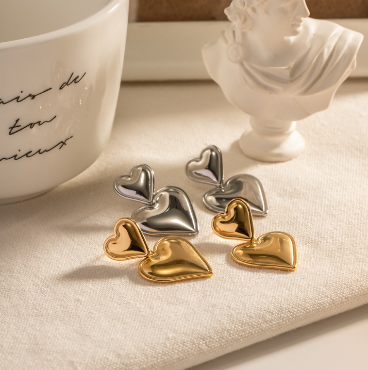 - A pair of beautiful double heart drop earrings in gold and silver stainless steel.
