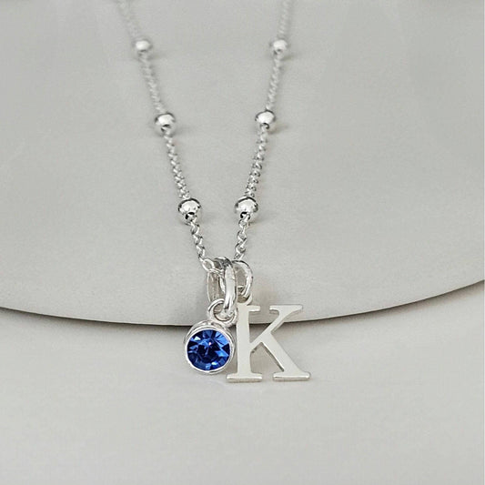 - Customizable stainless steel initial 'K' pendant necklace with a brilliant blue birthstone accent.