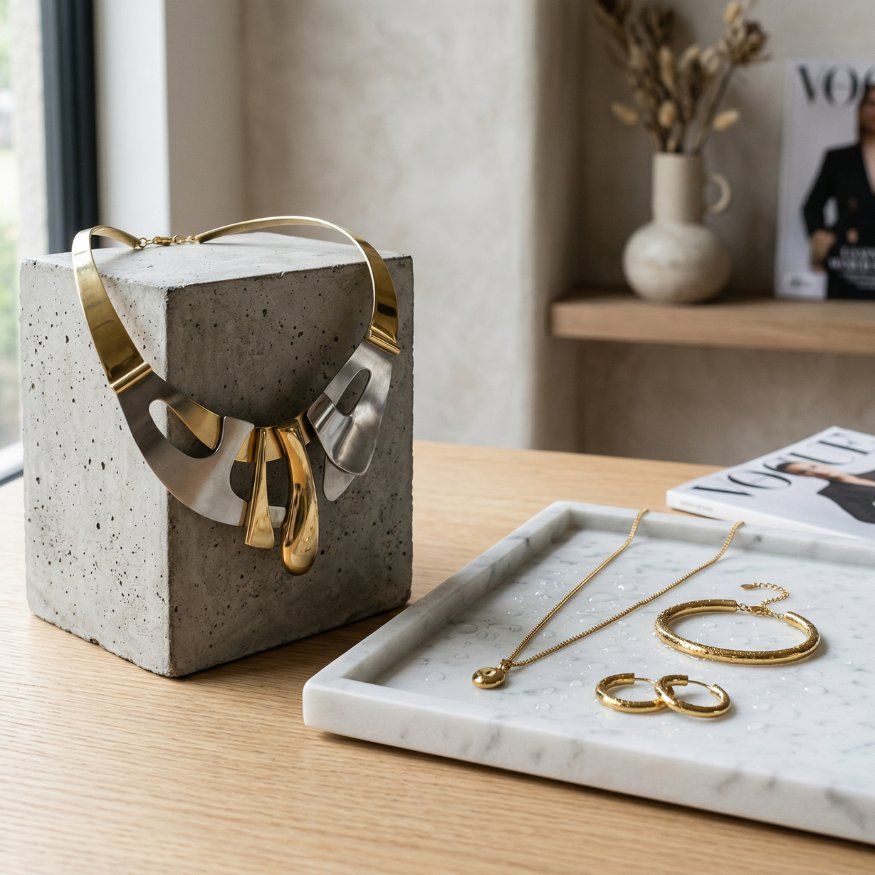 Modern mixed-metal geometric necklace and gold jewelry displayed on a concrete block and marble tray.