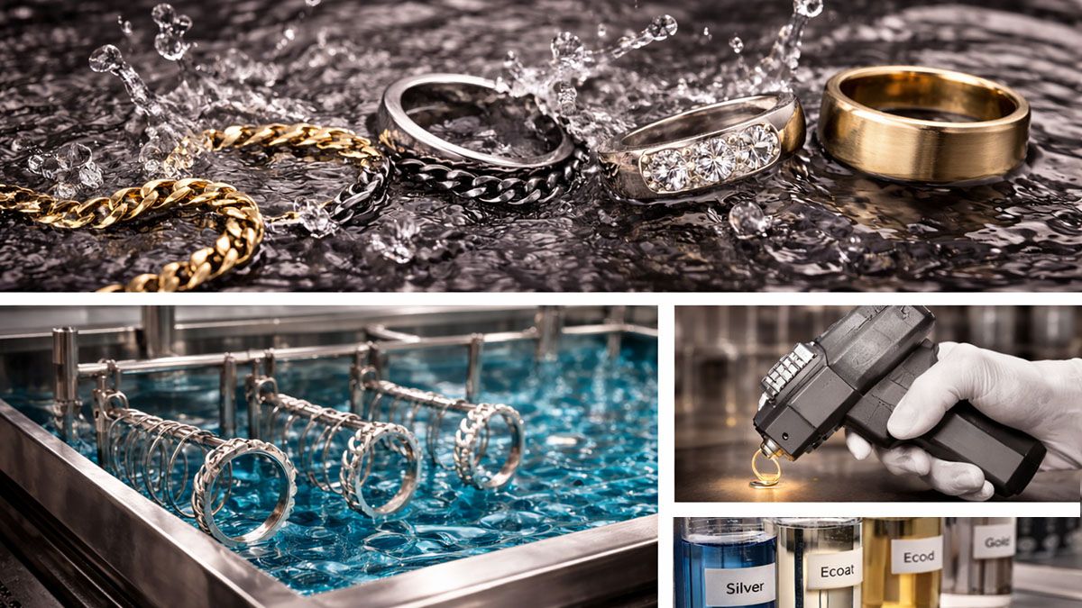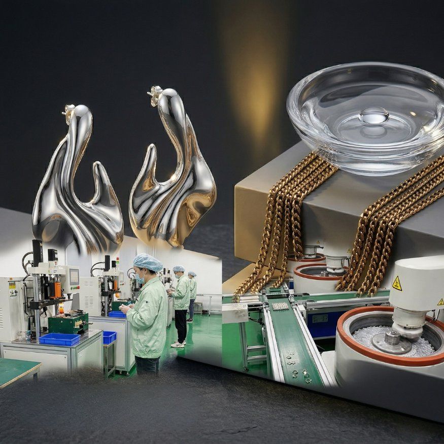 B2B collage of advanced CNC jewelry machinery, a clean factory line, PVD coating tank, and polished silver earrings.