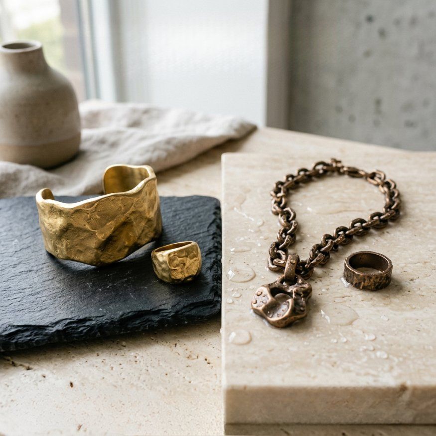 Artisanal brass jewelry, featuring hand-hammered texture on a large cuff, ring, and a heavy chain necklace.
