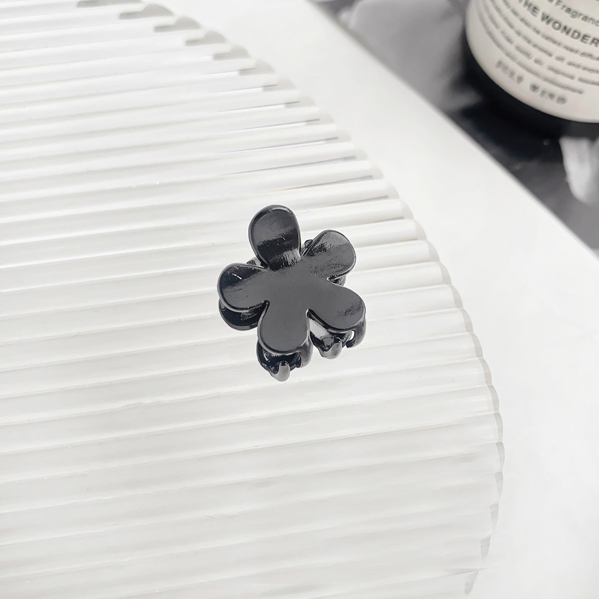 A detailed macro shot of a black four-leaf clover mini hair clip on a white surface.