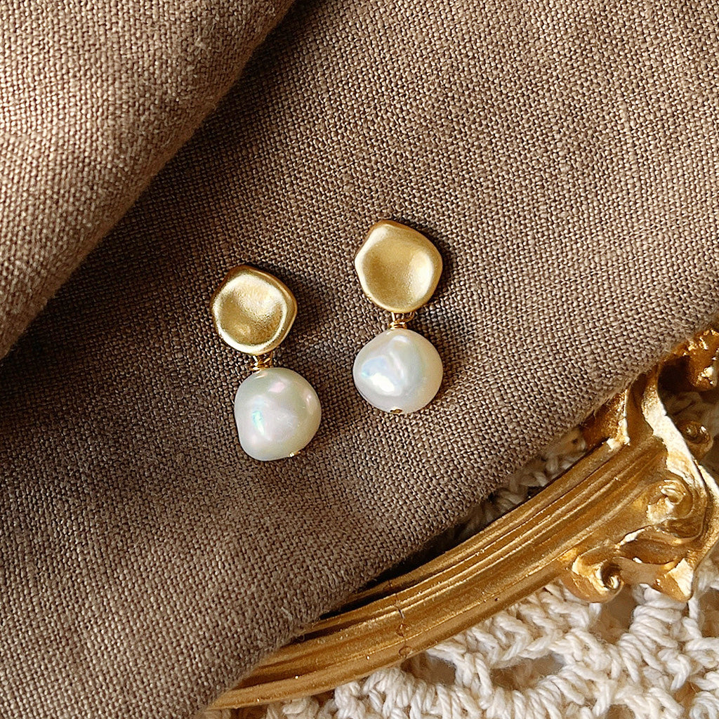 A pair of 14k gold baroque pearl earrings with a matte finish, showcasing their elegant design.
