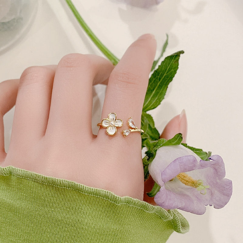 - Product Name: 14k Gold Plated Brass White Enamel Flower with Pearl and Zircon Open Finger Rings Set