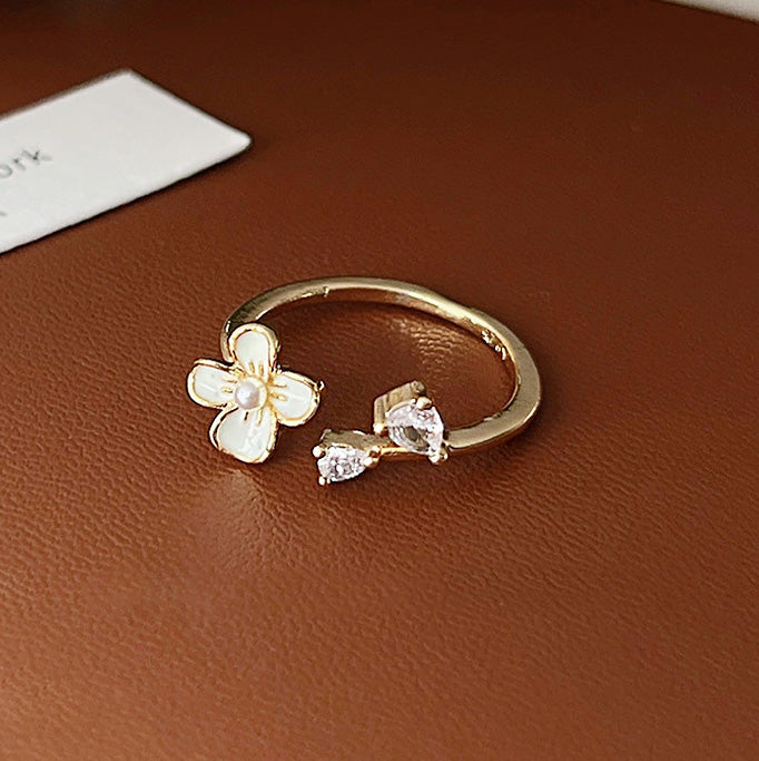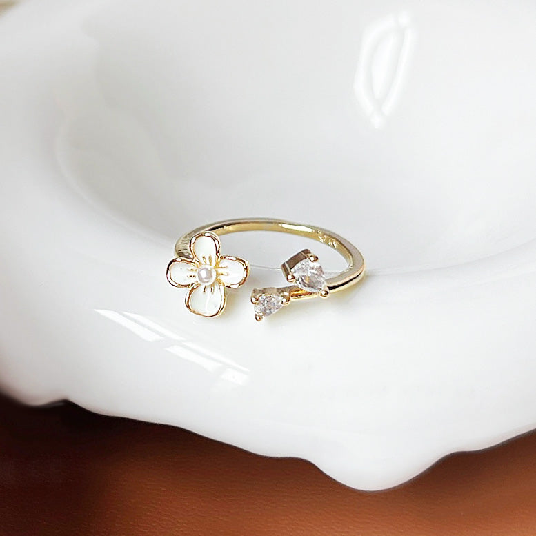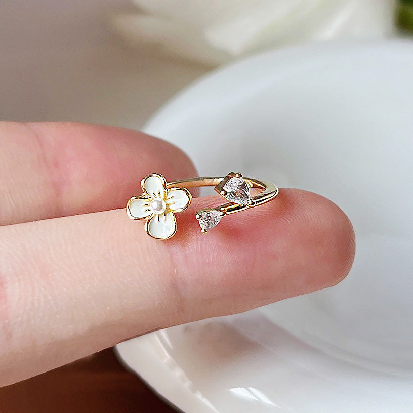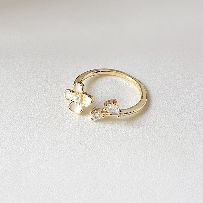 - Close-up of a gold open-finger ring with a white flower and two brilliant zircon stones.