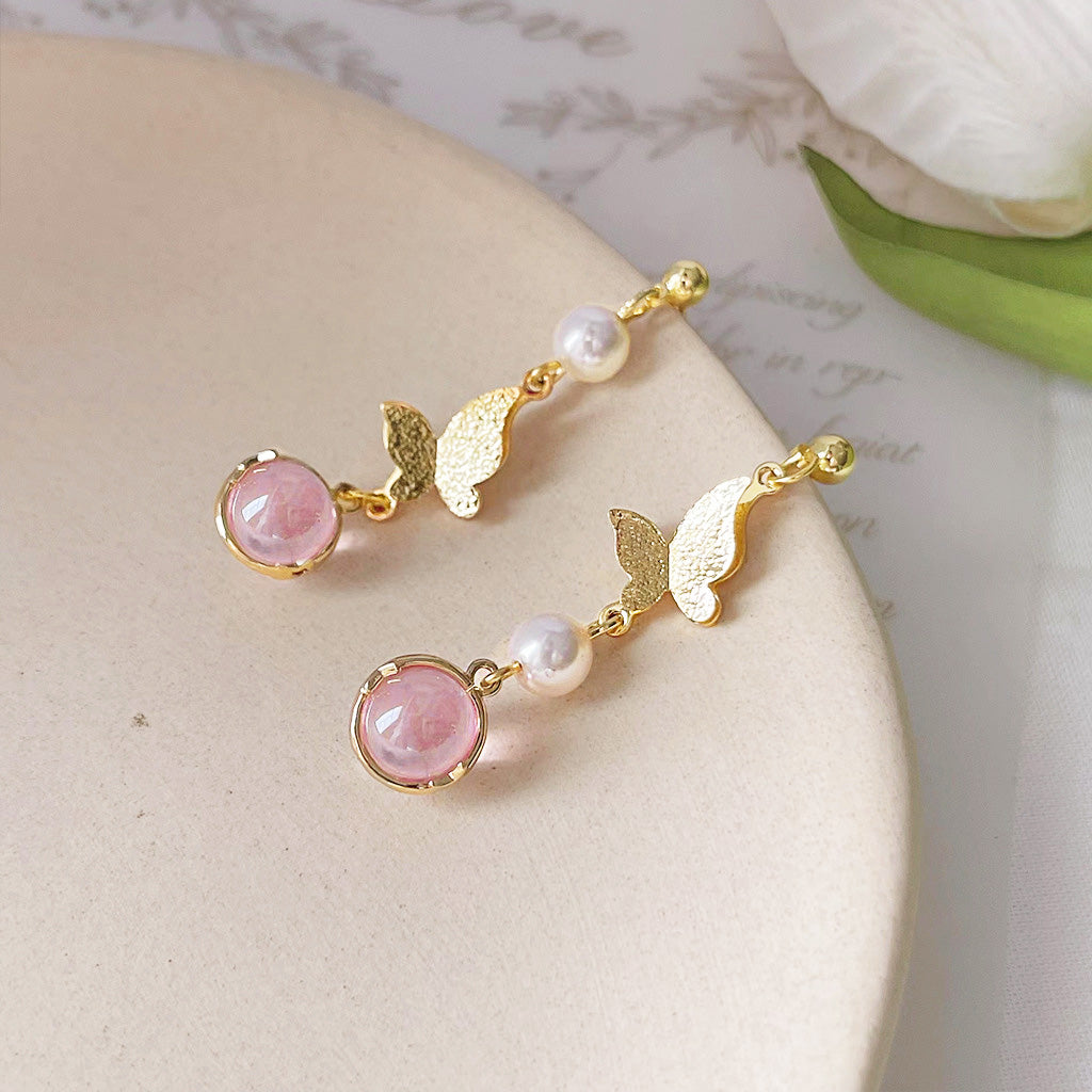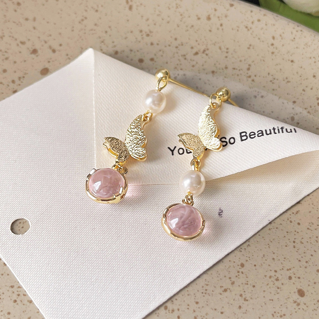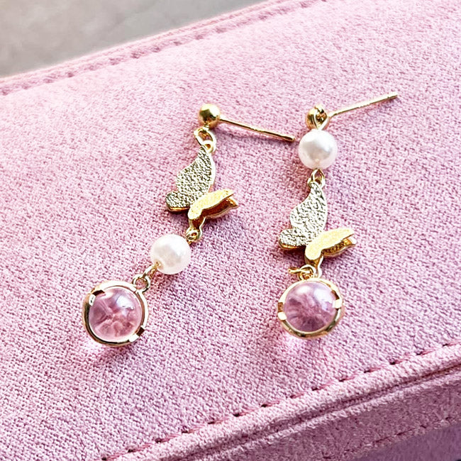 Detailed shot of the gold butterfly earrings showcasing the intricate pink gemstone and pearl details.