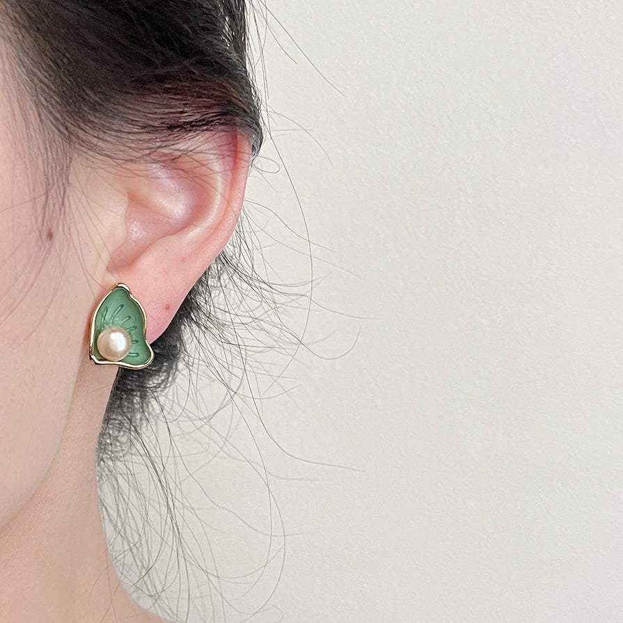 Detailed close-up of a green enamel and gold scallop pearl stud earring.
