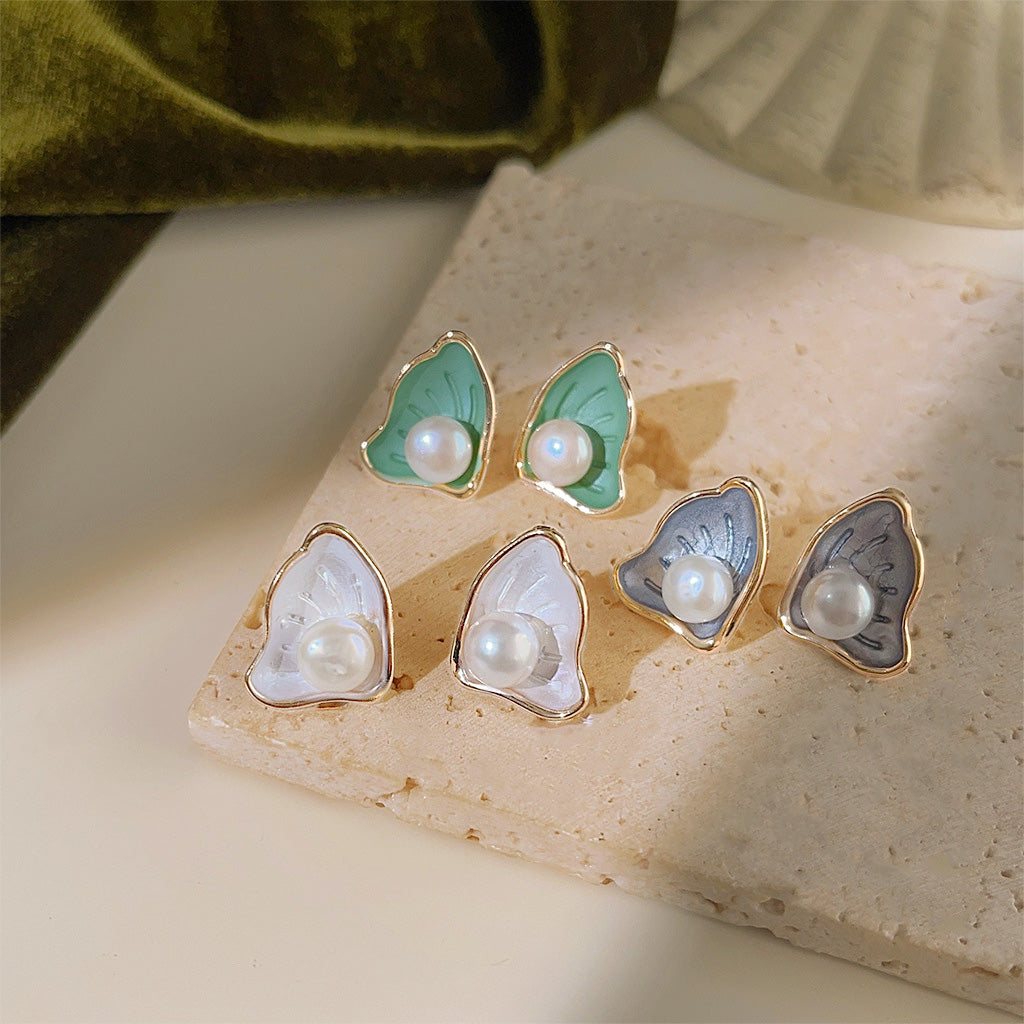 Three pairs of scallop pearl stud earrings in green, white, and gray enamel finishes.