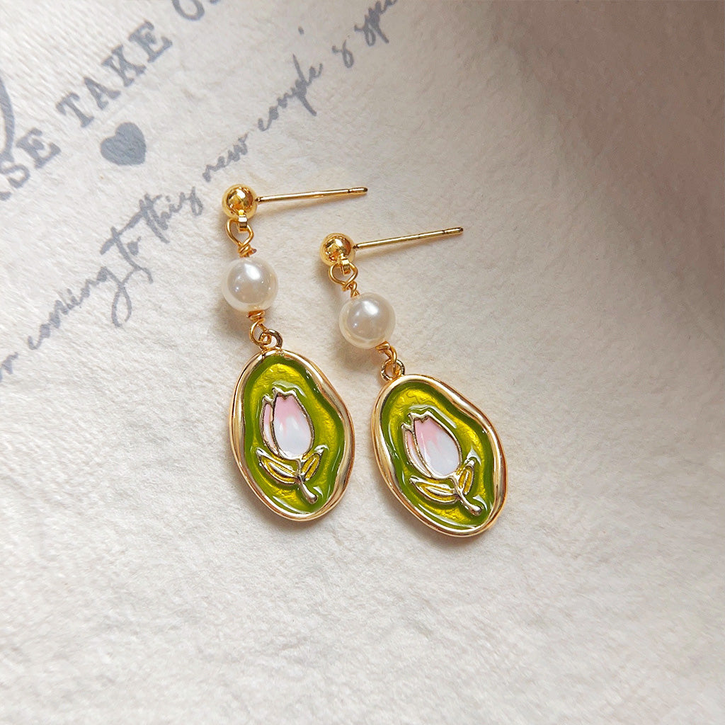 Model showcasing the elegant dangle of the enamel tulip flower pearl drop earring.
