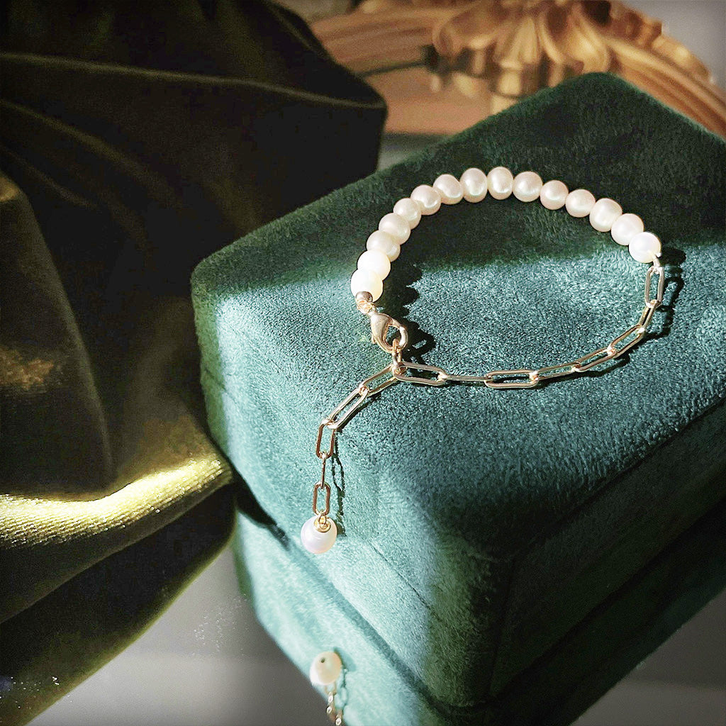 - A delicate pearl bracelet with a gold paper clip chain and charm, displayed inside a green velvet jewelry box.