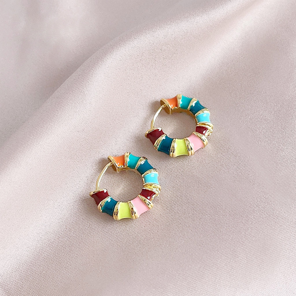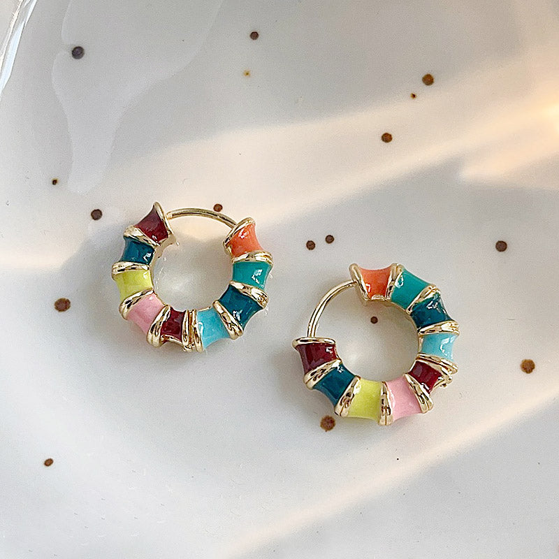 Detailed shot of the colorful hoop earrings, showcasing the gold base and intricate multi-color enamel details.