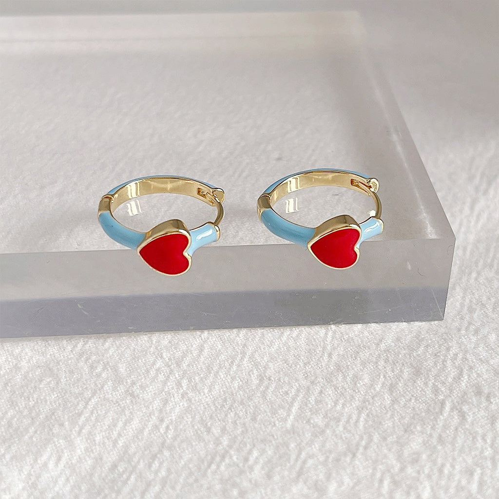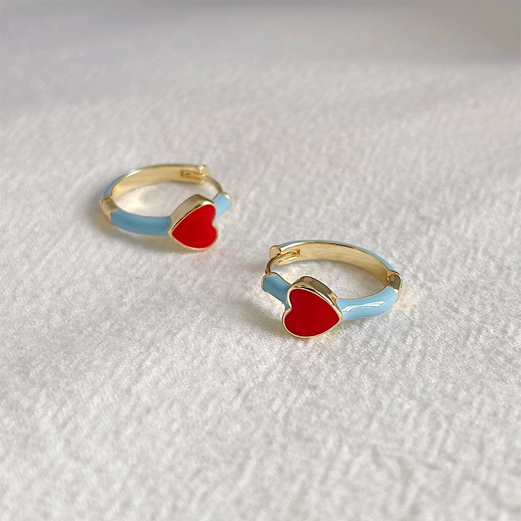 - Product Name: 14k Gold Plated Red Enamel Heart Huggie Hoop Earrings (5 pairs) Base Material: Brass Plating: 14k Gold Decoration: Red and Blue Enamel Style: Huggie Hoop Unit: Sold as a set of 5 pairs