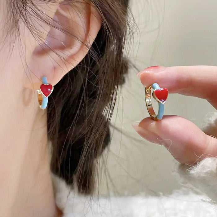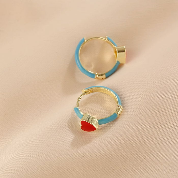Each earring is meticulously crafted from durable brass and finished with a lustrous 14k gold plating. The design features a playful combination of vibrant red and cool light blue enamel, centered around a classic heart motif. The huggie hoop style ensures a secure and comfortable fit for all-day wear.