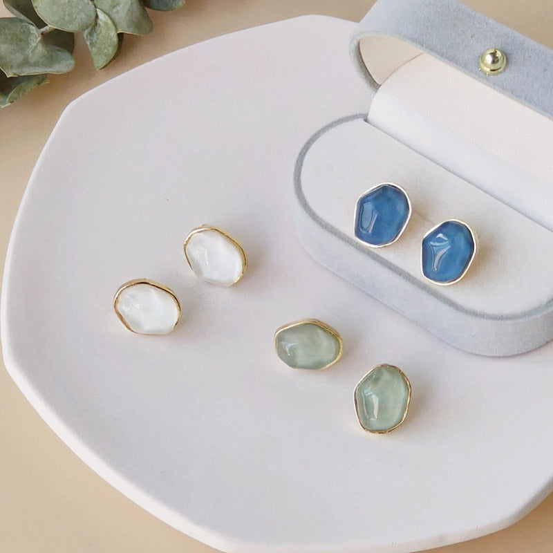 Discover modern elegance with our set of five pairs of 14K gold-plated stud earrings. Each pair features a unique, irregular geometric design crafted from high-quality colored resin, offering a contemporary and artistic touch to any outfit. Made from a durable brass base with lustrous 14K gold plating, these earrings are designed for both style and longevity. The set is available in three captivating color palettes—serene white, deep blue, and fresh green—allowing you to mix and match or choose the perfect hue for any occasion. These lightweight and versatile stud earrings are perfect for daily wear or for adding a pop of color to your evening look.