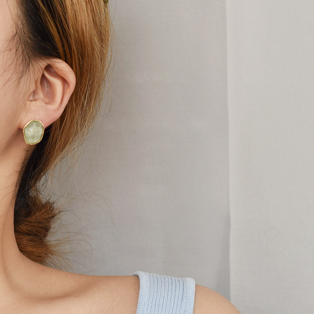 Embrace a unique aesthetic with these irregularly shaped stud earrings. The organic, geometric forms are inspired by natural stones, giving each piece a distinct and modern character. The polished resin captures the light beautifully, creating a subtle yet eye-catching effect that complements both casual and formal attire.