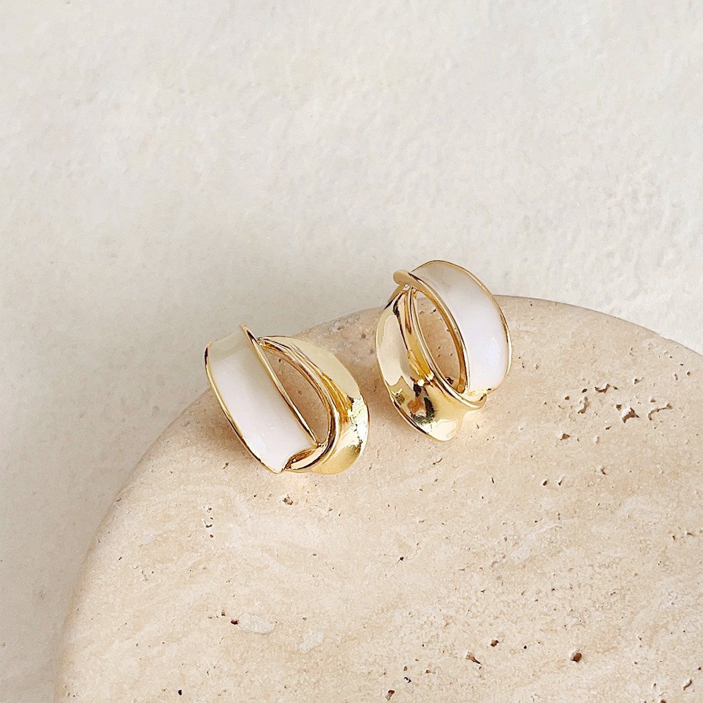 A pair of gold and white enamel earrings from the set, artfully placed on a beige decorative stone.