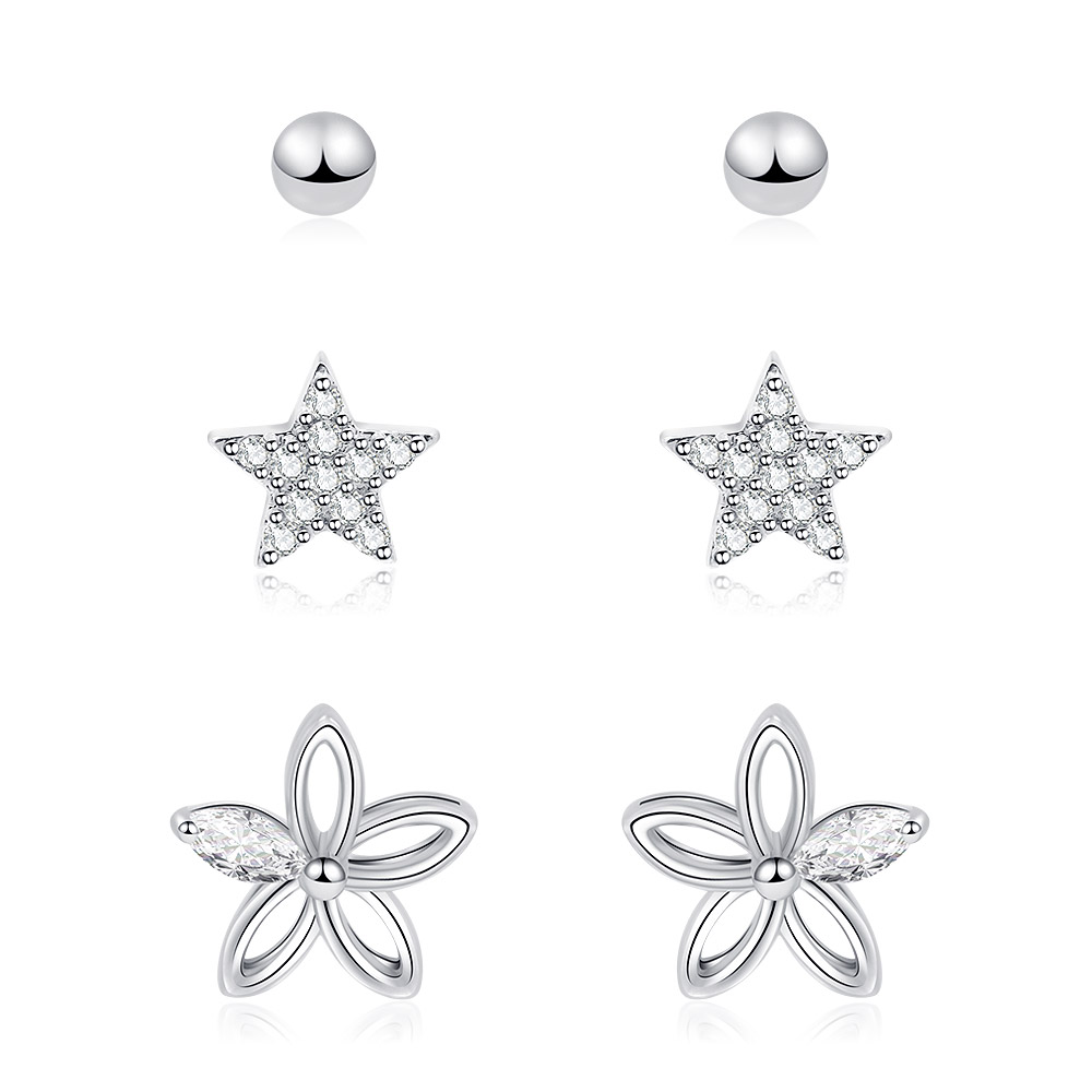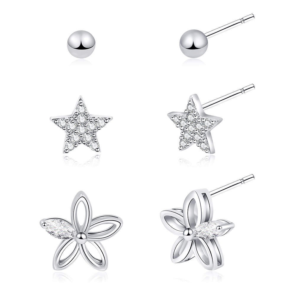 Elevate your style with this beautifully curated set of three stud earrings from JR Fashion Accessories. This collection features one pair of classic 3mm ball bead studs, one pair of sparkling 6mm star studs with cubic zirconia, and one pair of delicate 9x9mm open flower studs. It's the perfect value set, offering three distinct styles in one package.