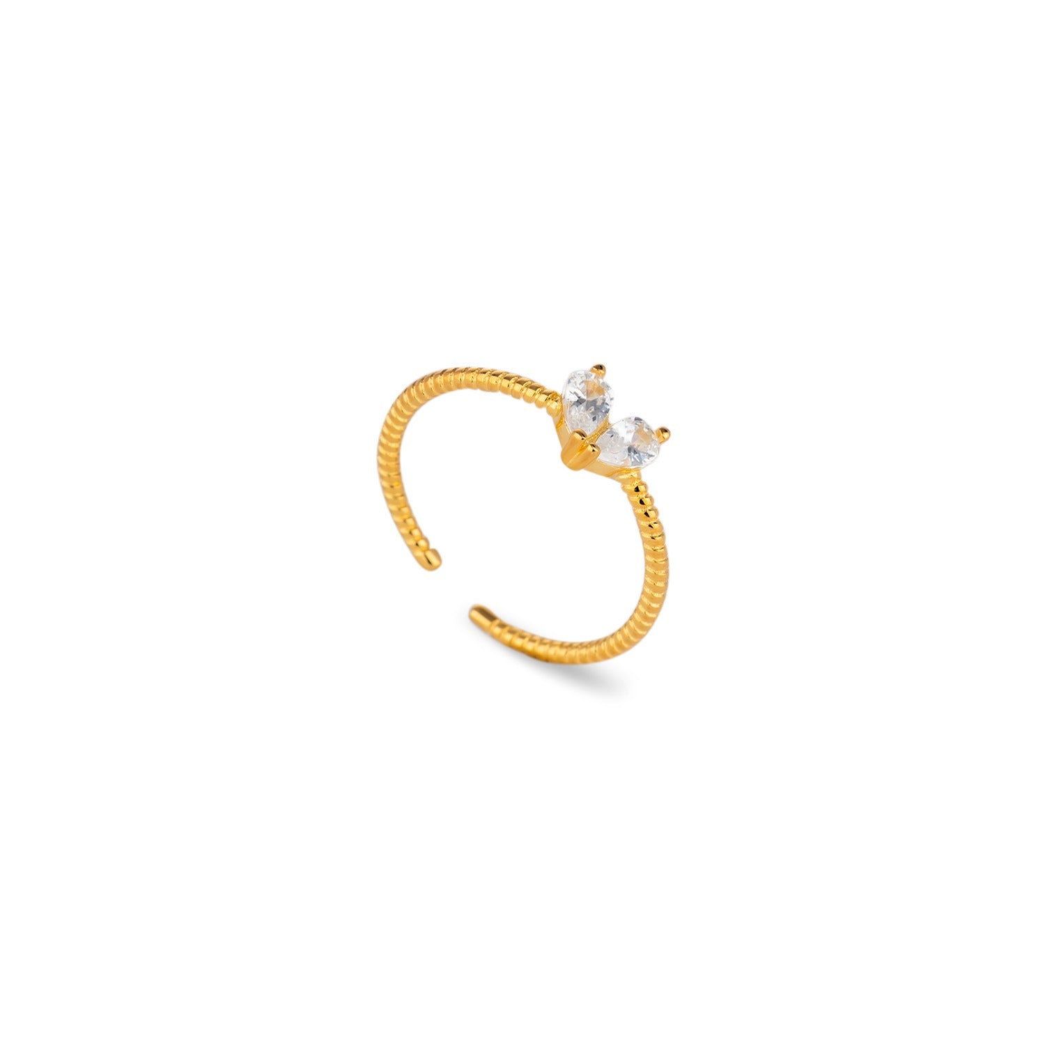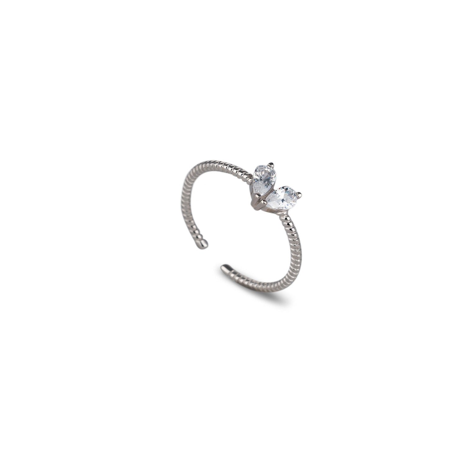 A stylish open-ended silver ring with two heart-shaped gemstones, showcasing its modern design.
