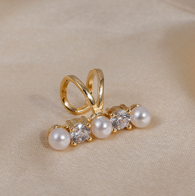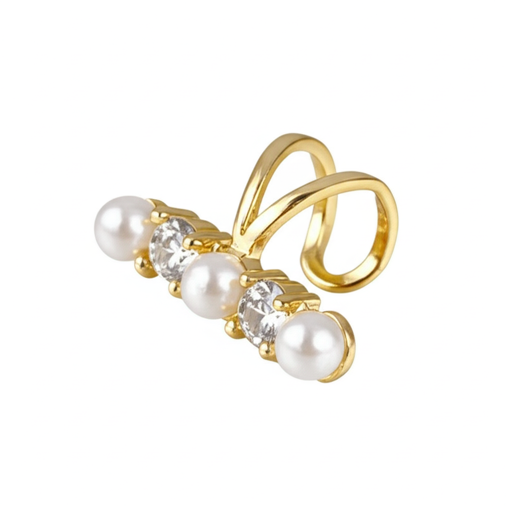 Close-up of a gold non-pierced ear cuff with a pearl and clear cubic zirconia stones.