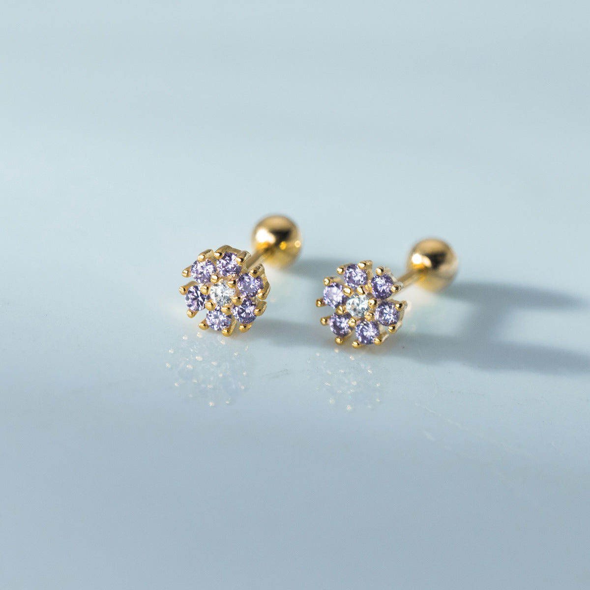 - A pair of gold flower stud earrings with elegant purple and clear cubic zirconia gems.