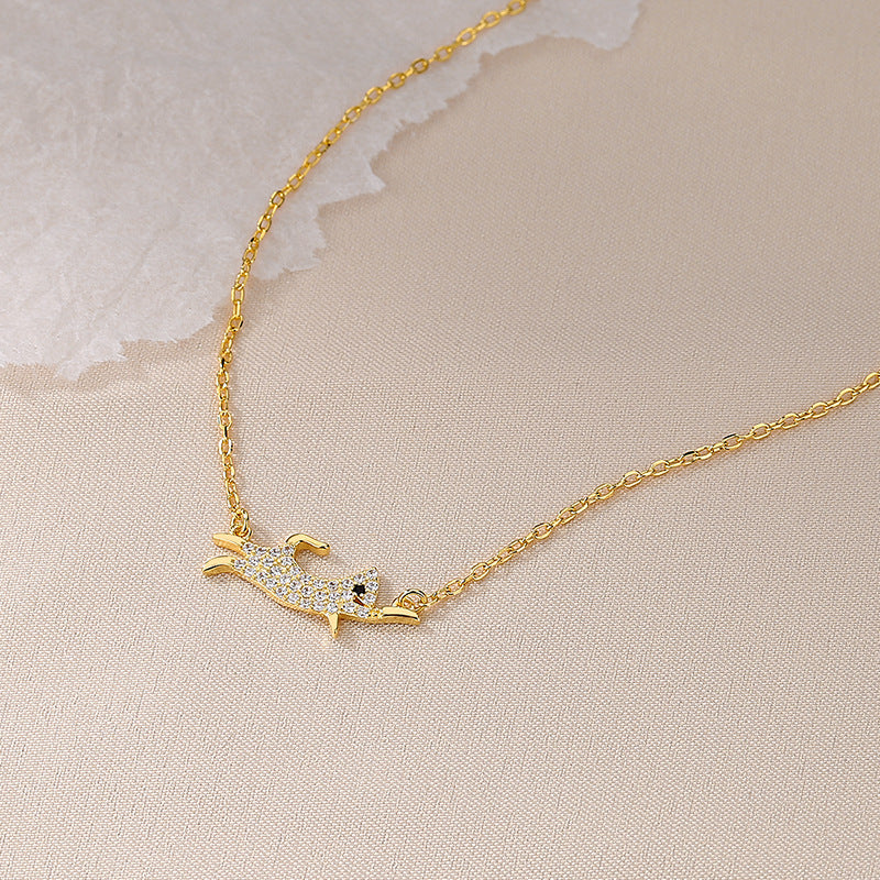 Close-up of the gold-finished dog pendant necklace, showcasing its warm tone and sparkling gemstones.