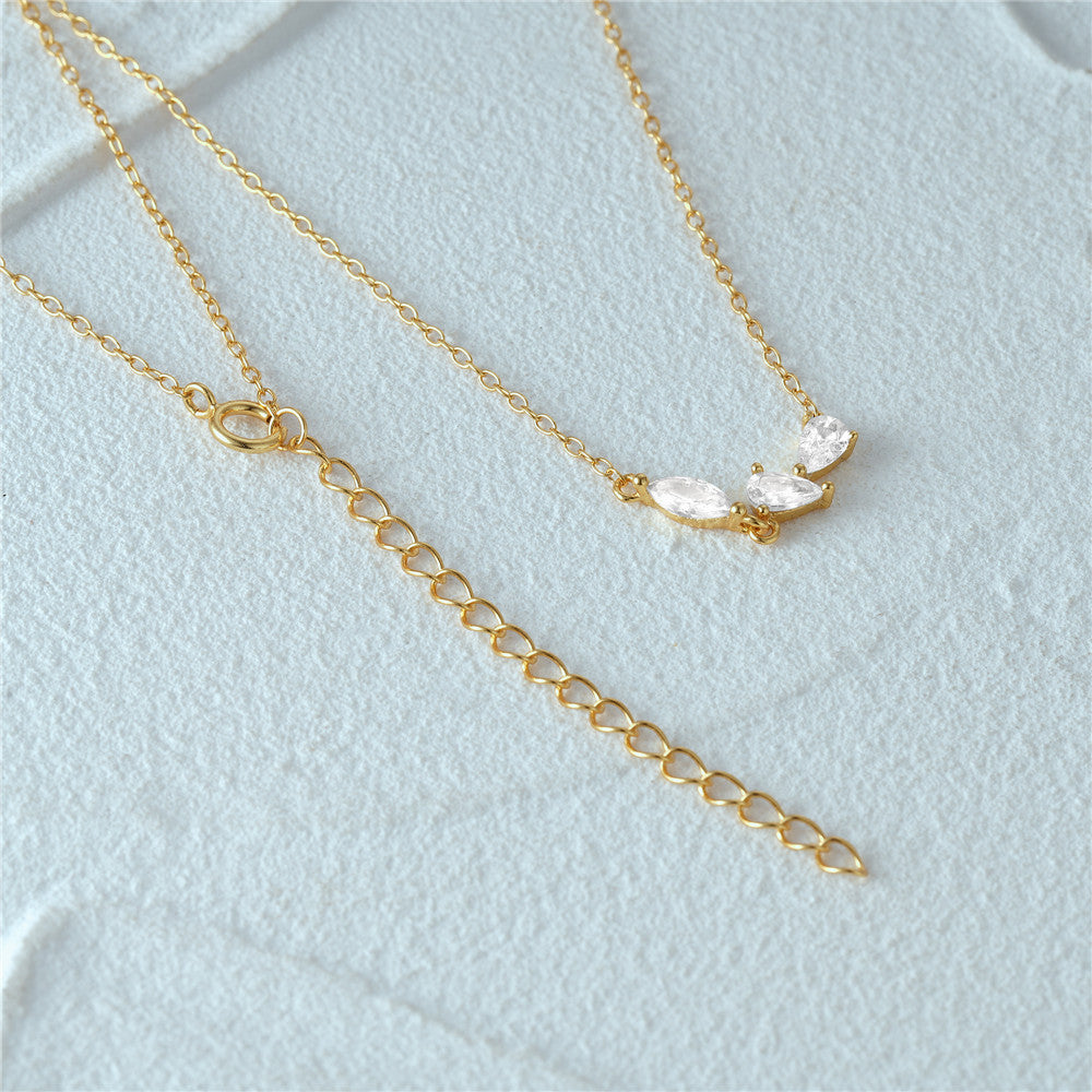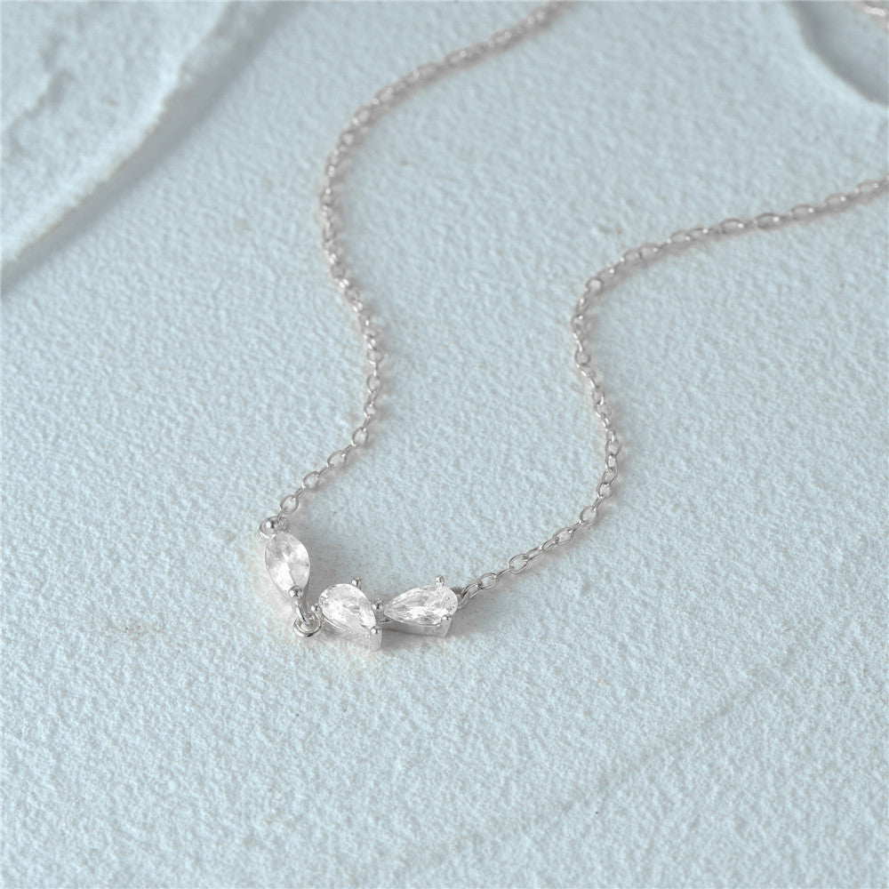 A clear product shot of the silver necklace with its three-stone zircon pendant.