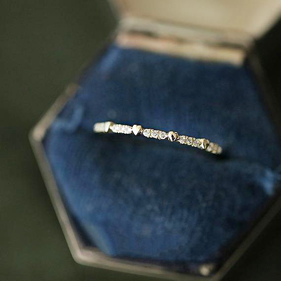 Style: Thin band, Stackable, Heart motif, Minimalist