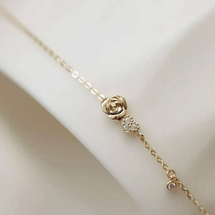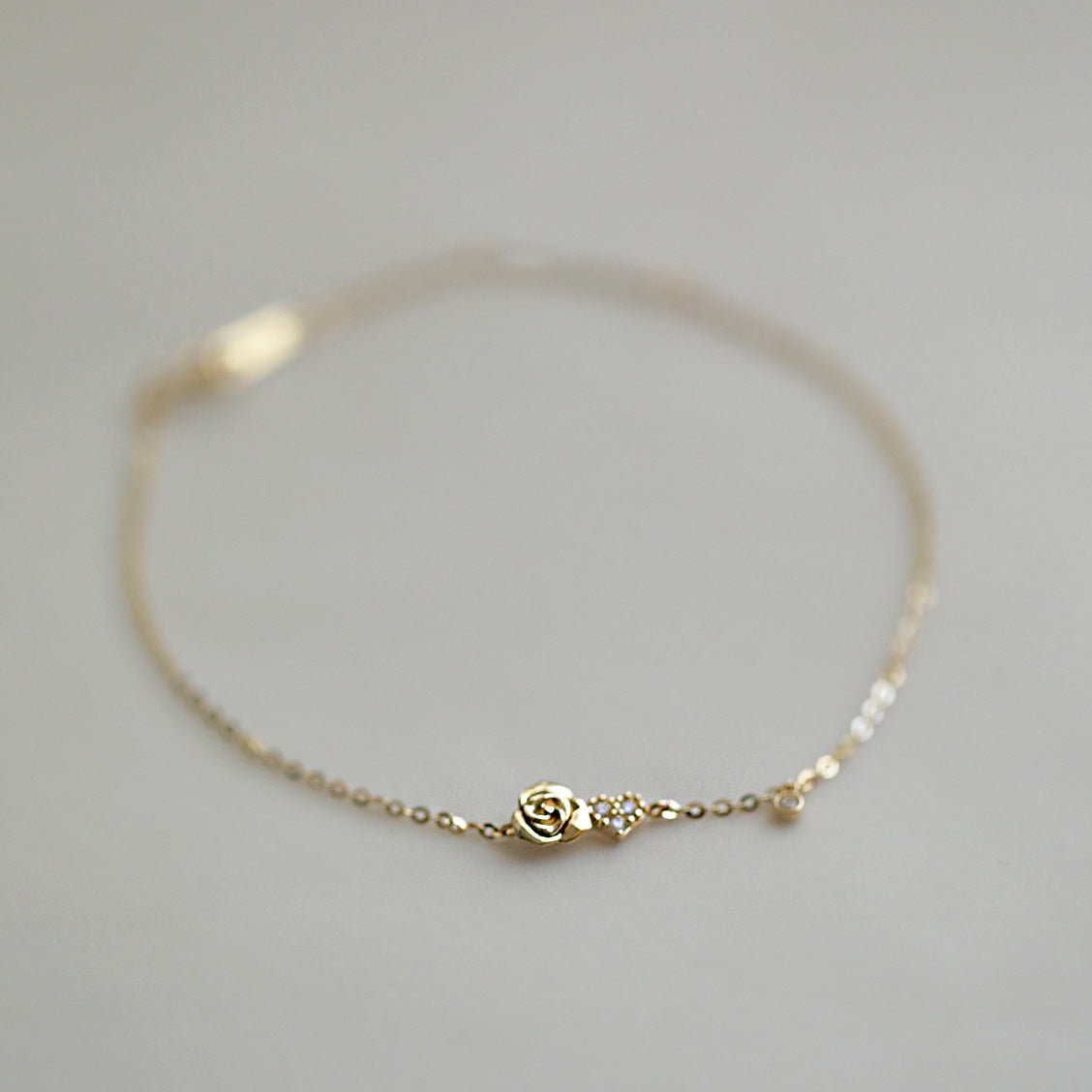 Another perspective of the tiny rose flower charm bracelet, highlighting its delicate design.