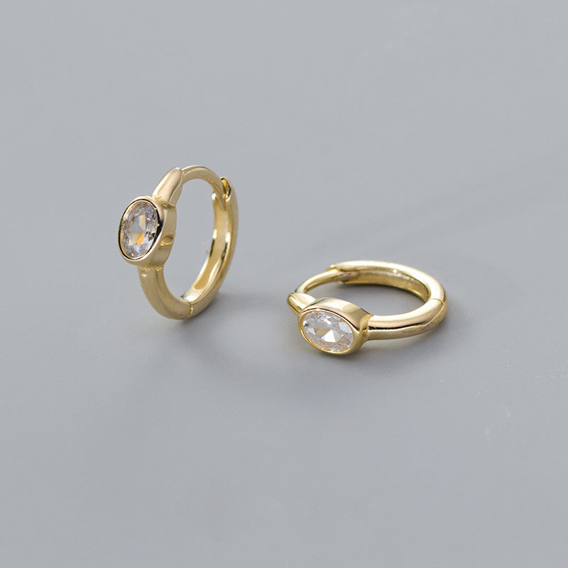 Elegant gold-plated huggie hoop earrings with brilliant clear oval gemstones.