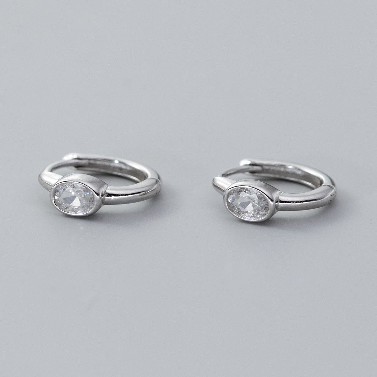A pair of sterling silver huggie hoop earrings featuring clear, sparkling oval gemstones.