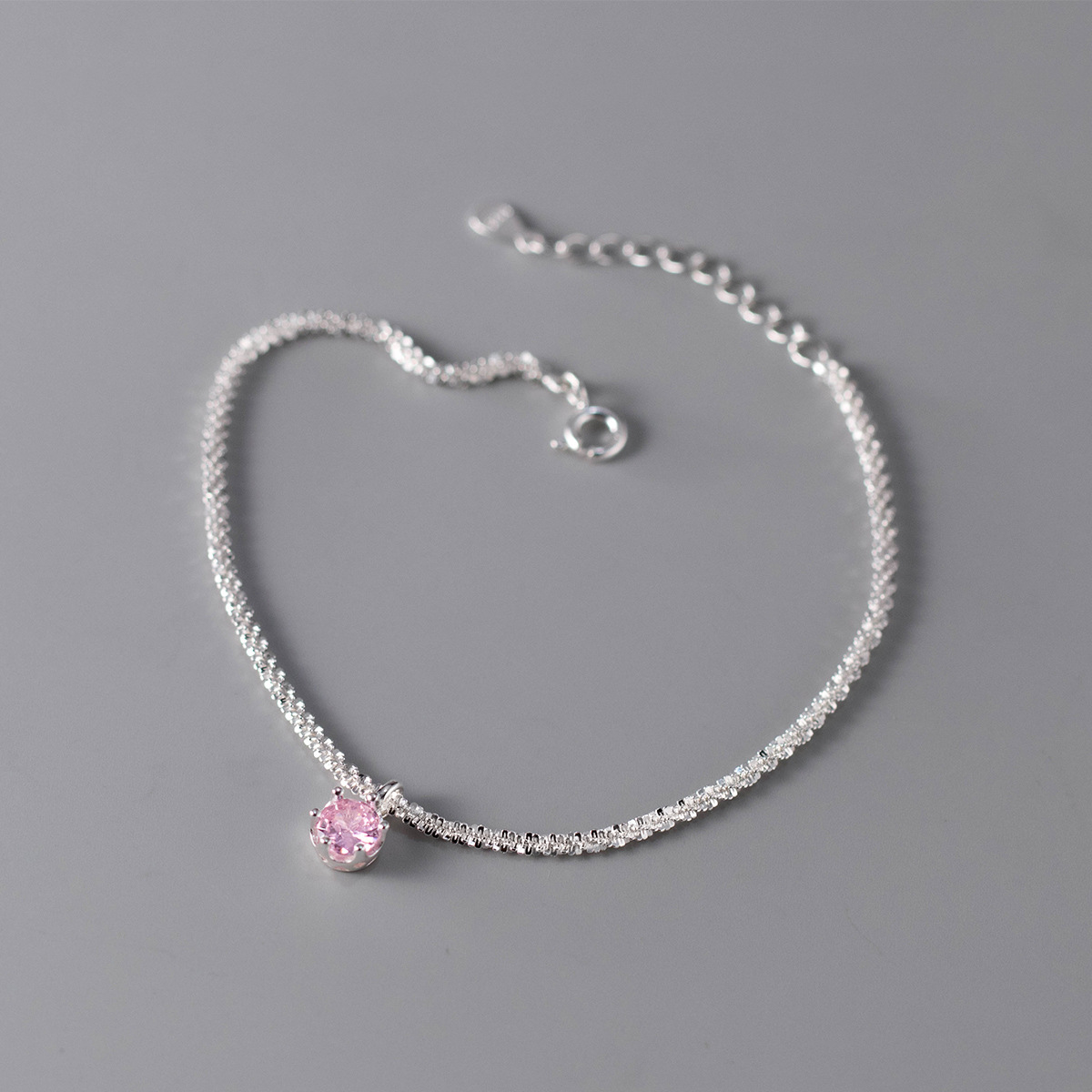 Close-up shot of the delicate 925 silver bracelet featuring a soft pink zircon, perfect for summer fashion.