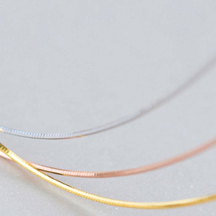 - Close-up of the 925 silver snake chains in gold, silver, and rose gold finishes.