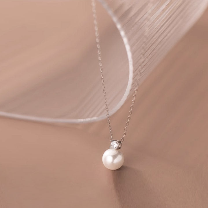 Angled view of the pearl necklace highlighting the sparkling cubic zirconia accent.