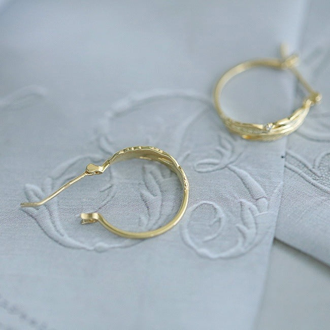 These hoop earrings feature an elegant fusion of feather and leaf motifs, intricately crafted in 925 sterling silver and plated with warm 14K gold. The subtle addition of cubic zirconia brings a refined sparkle, making them a graceful choice for everyday wear or special moments. The design blends soft organic lines with shimmering accents, capturing the essence of nature in a delicate, feminine silhouette. The compact hoop design is timeless and versatile, while the detailed feather-leaf pattern adds a poetic, graceful flair. As a leading OEM/ODM manufacturer, JR Fashion Accessories offers customization options for brands looking to create unique jewelry lines. Contact us for wholesale inquiries and custom design services.