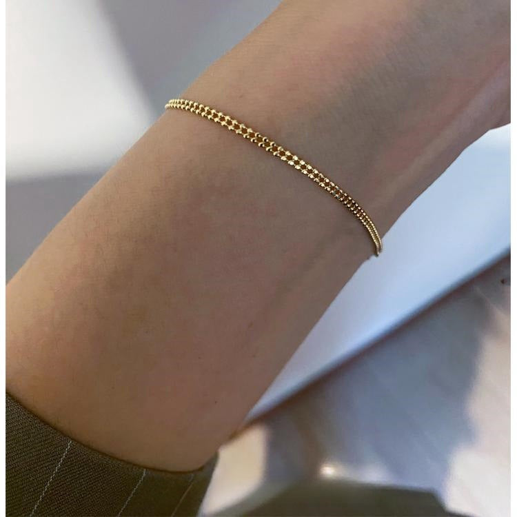 - Elegant Design: A clean and modern double-strand bracelet with delicate bead accents evenly spaced along each fine chain. The tiny beads reflect light for a soft shimmer, while the layered design creates effortless depth and texture.