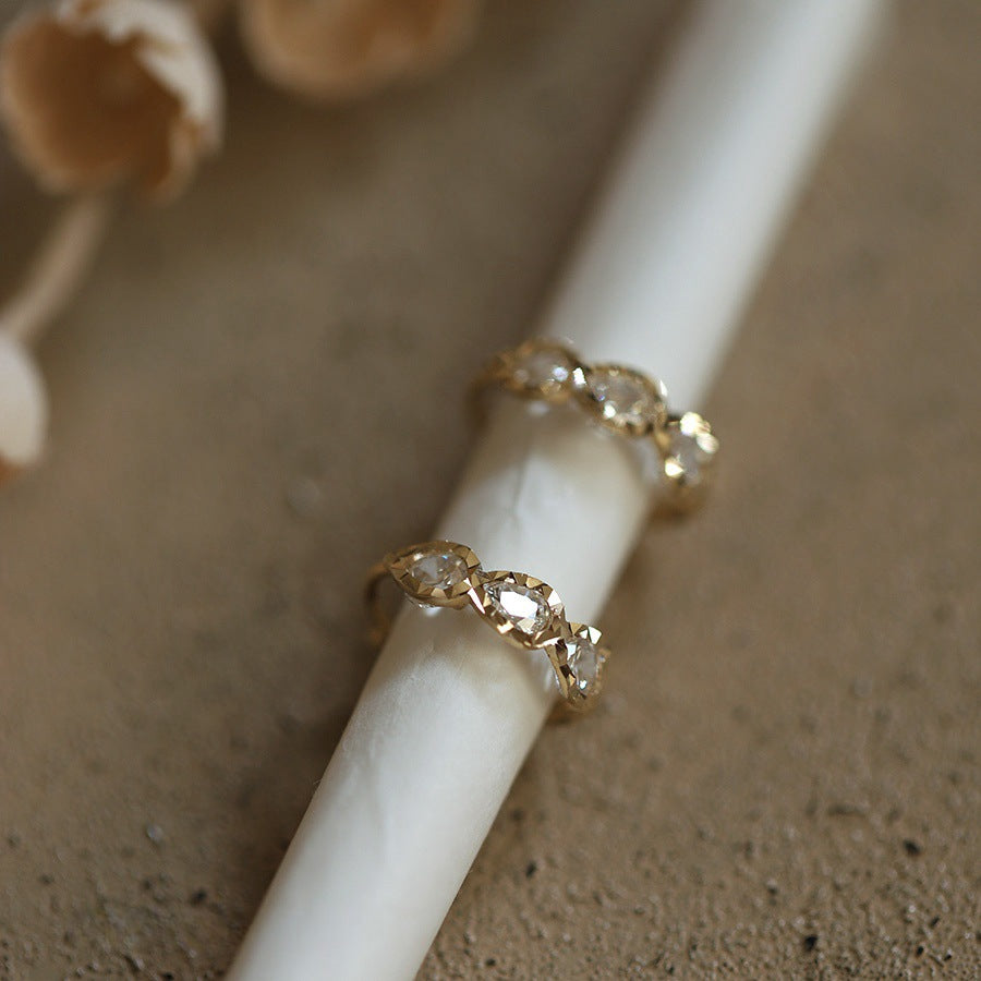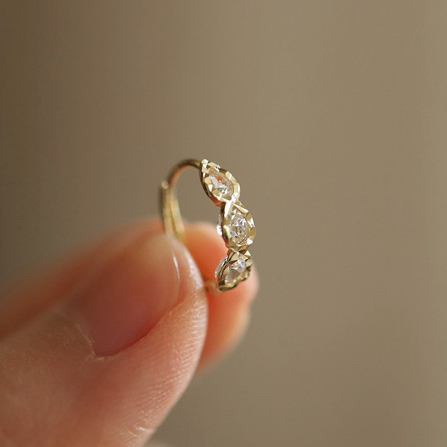 A pair of the triple teardrop CZ huggie earrings displayed, showcasing their brilliant shine.