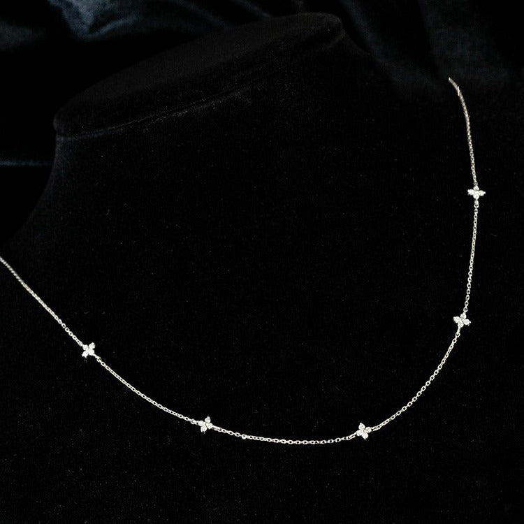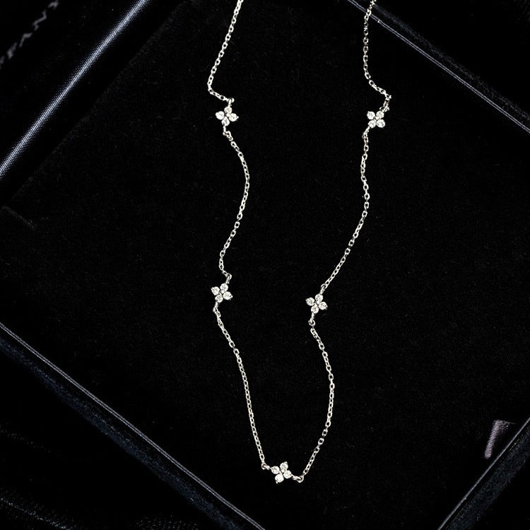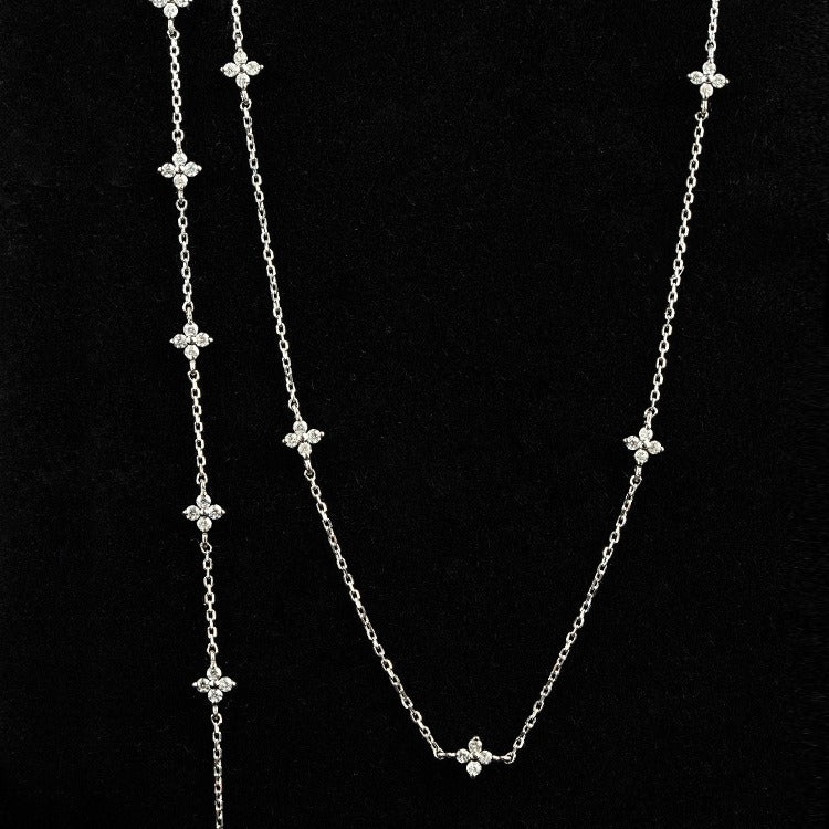 Elegant silver necklace featuring intricate flower clusters made of cubic zirconia.