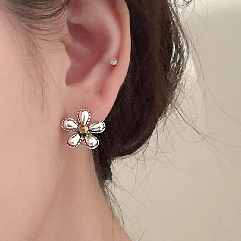 A pair of 925 sterling silver antique flower earrings with gold centers displayed on a white background.