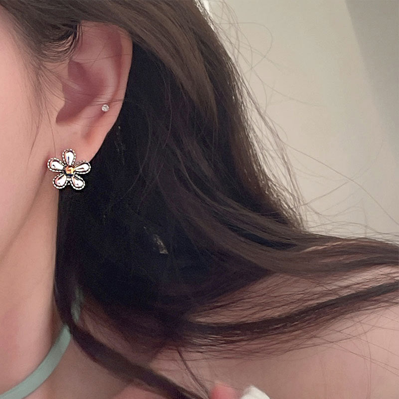 Side profile of the flower latch-back earring highlighting the rhinestone-encrusted edge.