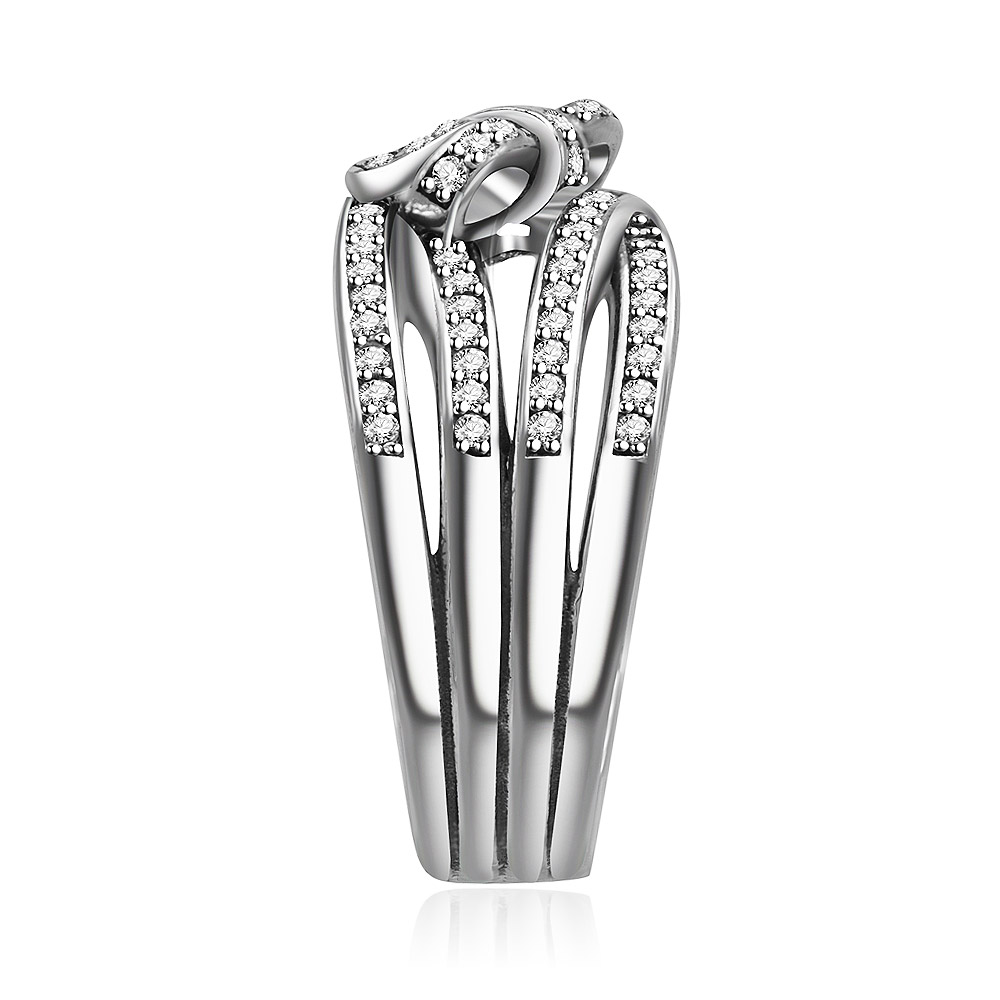 Side profile of the Sterling Silver Blossom Ring, highlighting the intertwined band and cubic zirconia accents.