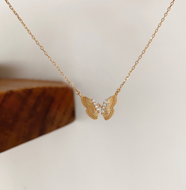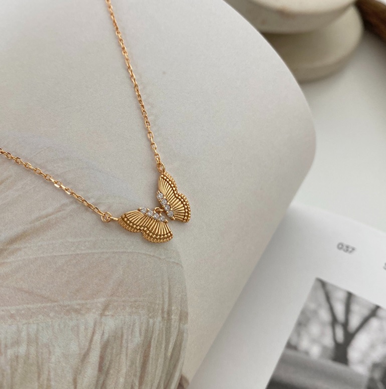 - Detailed view of the butterfly pendant, highlighting the textured wings and sparkling cubic zirconia stones.