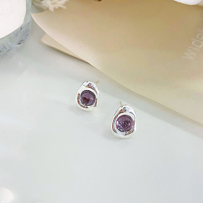 - A pair of elegant sterling silver stud earrings with deep purple opal gemstones.