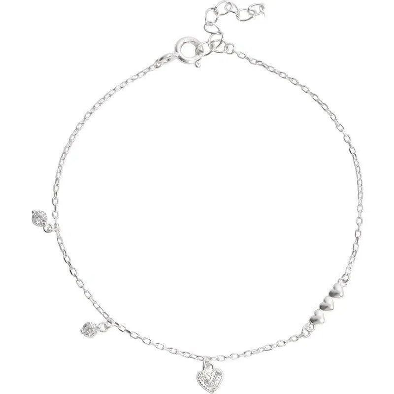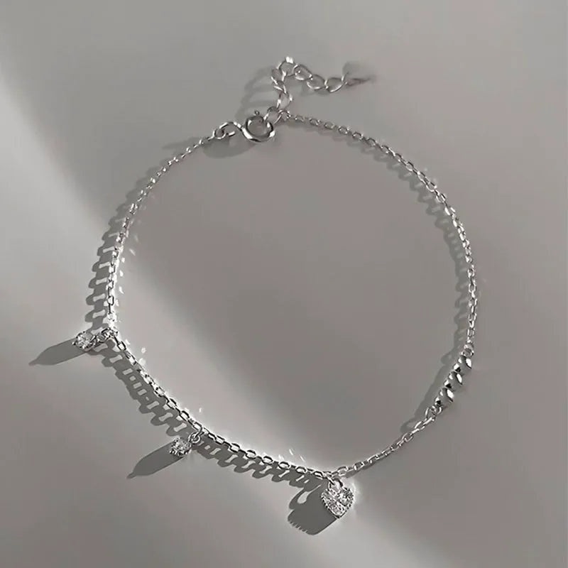 - Elegant Design Style: The bracelet’s asymmetrical layout includes a central heart charm encrusted with CZ stones, two bezel-set CZ droplet charms, and three smooth silver hearts. This unique combination gives the bracelet charm, motion, and a sense of connection—visually representing love, family, or friendship.
